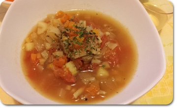 にんじん、まいたけ、トマト、セロリ、タマネギ、ジャガイモ、豚肉が少し入っています。