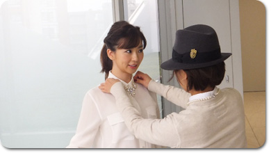 スタイリストの佐藤佳菜子さん。ネックレスの位置を細かくチェック。