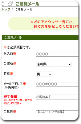 ○ご意見の冒頭に【auネーミング募集】と書いてください。