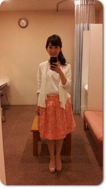 「今回はトップスを白でまとめ、スカートにアクセントでピンクを添えてみました」