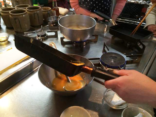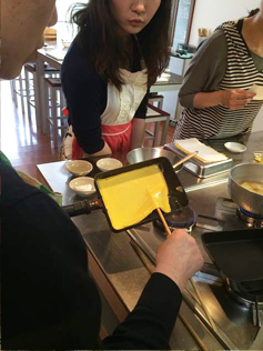 3.お玉で一杯すくってフライパンをくぐらせたら、残りの卵液を戻す(そうすると薄くなる)
