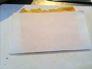 8.周囲のパリパリ部分をカットして4等分にし、重ねて叩くように切っていく