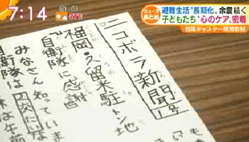 自らも被災しているのですが、避難所となっている学校で水を配ったり、食べ物を届けたり、さらには「ニコボラ新聞」なるものを作って配ったり。