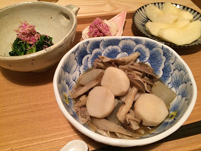 芋煮と、もって菊のおひたし、デザートにラ・フランス