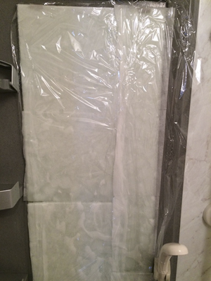 クエン酸を溶かしたお湯をキッチンペーパーに浸し、鏡に貼ります。