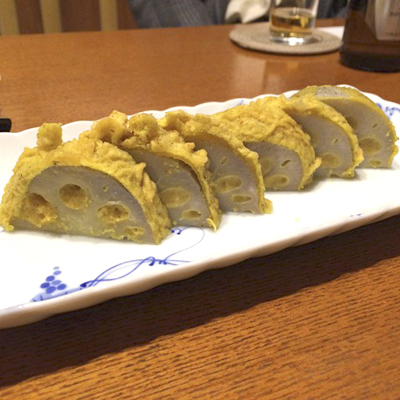 揚げたての辛子蓮根は、外がサクサクしていてとっても美味です。