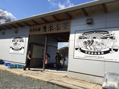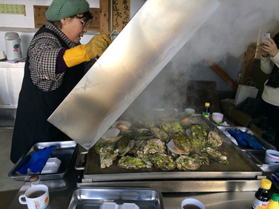 女将さんオススメの、唐桑半島で漁業協同組合が開いている牡蠣小屋へ。