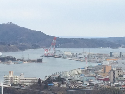 気仙沼湾の近くで、出番を待つアーチ状の橋を見かけました。