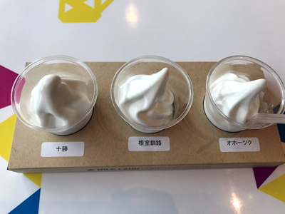 テラスで1日100個限定の『ソフトクリーム3地域の食べくらべセット』を買って食べ比べ。
