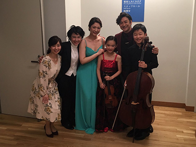 向かって左から、指揮の田中祐子さん バイオリニストの小林美樹さん、チェリストの北村陽くん、バイオリニストの大久保瑠名さん、司会の石丸幹二さん。