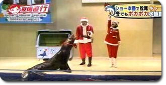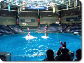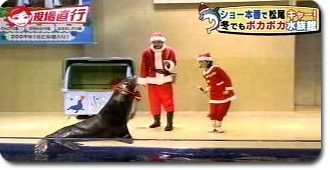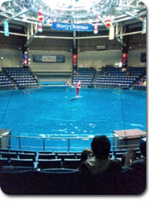 イルカとサンタ姿のトレーナーの息の合ったショーに感激。