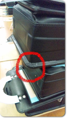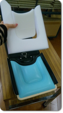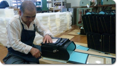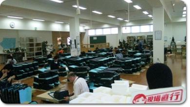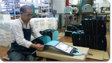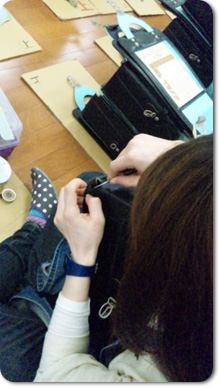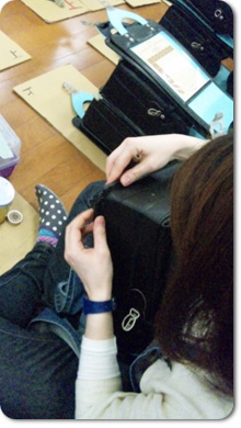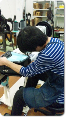 ランドセルの背中の部分と箱の部分をつなぎ合わせる作業をしていました。