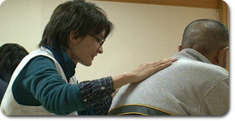 森川医師は「からだを触らせていただいてよろしいでしょうか?」と聞いて、被災者の肩に手を置きます。
