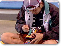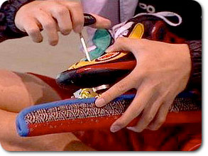 靴の調整に余念がありません 靴は青、黄、黒、緑、赤の五輪カラーですよ!