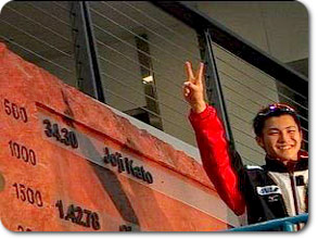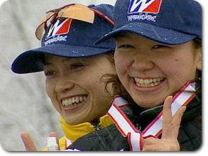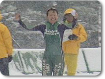 雪の中で岡崎選手と競う吉井選手・・ 初の全日本スプリントを制した瞬間 表彰台の真ん中で