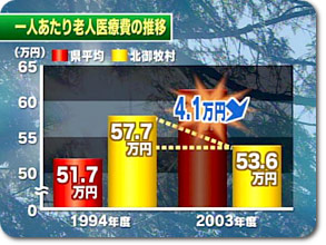 平成6年から10年間に、長野県の老人一人当たりの医療費は10万円近く多くなっていますが、北御牧村では一人あたり4万円少なくなっているのです。 |
