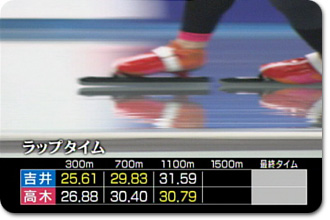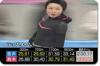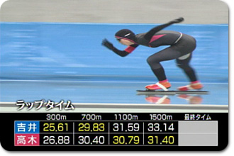 前半、2周目までは吉井さんが早いラップを刻みますが、1100mを過ぎた3周目からは、木さんのラップタイムが上回ってきます。