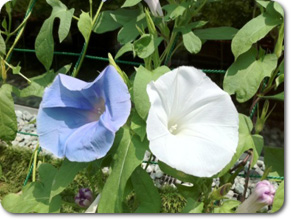 さらに! 朝顔・夕顔は淡い青や白、赤といったきれいな花をつけ、 スイカやメロンも、小さな、でもしっかりとした実をつけていました♪