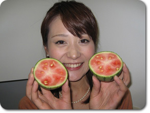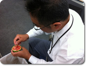 実は小さくても、中はしっかりと赤くなって、まさに“スイカ!” 初物なので、部長に味見をしてもらいました♪