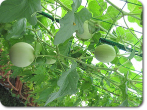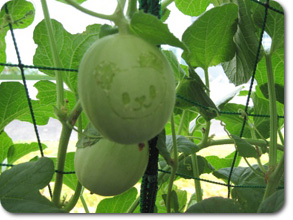 一方、メロンは拳ほどの大きさに成長!! 「若い実に傷をつけると、その傷の模様が出来る!」という情報を得たため、 見事な大きさになって、誰かに先を越さぬうちに、 秘かに『myメロン』を確保しておくことにしました♪