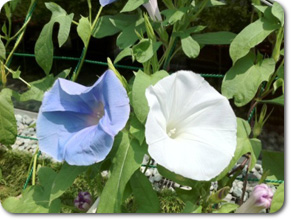 色とりどりの柔らかく美しい花を広げ、 一日を通して私たちを楽しませてくれた、朝顔と夕顔。