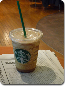 携帯プレイヤーで音楽を聴きながら、フラペチーノを片手に新聞を広げる。