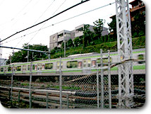 山手線の線路沿いには、電車が間近に見られる場所が幾つかあります。駅前からのゆるやかな坂道に沿って、フェンスを隔ててすぐ隣を電車がごうごうと通り過ぎていく。