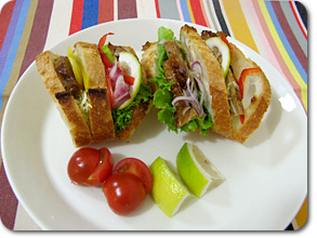 バゲットをトーストして、キャベツを千切りにして、お取り寄せの焼き豚を挟んで…。