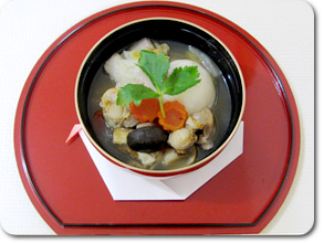 前日に作ったお雑煮を朝食に。我が家は、父の故郷の瀬戸内海・水軍風。