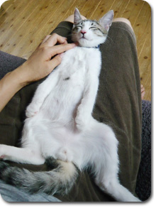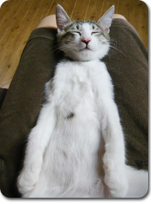 さらには、 外から帰ってきたとき、2階からひょいっと顔を見せに出てきてくれる。 ソファに座っていると、体をすりっと寄せてくれる。 さらには! ひざの上でくつろぐと、このポーズ。