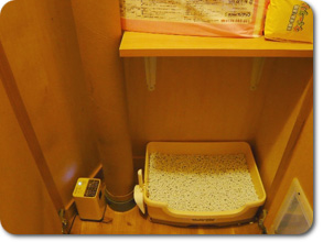 ニオイに敏感な家人がいるため、 “クサイ”とよく聞く猫のトイレ問題は、喫緊の課題でした。 そこで、 トイレはトイレに置くのがよかろう、と思い至り、 人間のトイレにもともとあった物置を改造することに。 (扉だけの狭いスペースで、以前は掃除機など置いていました。)