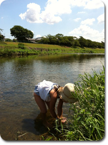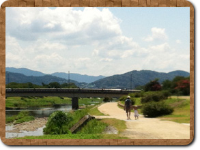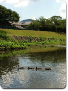 35度を超える昼下がり。 じりじりと照りつける太陽の日差しに、盆地パワーを実感。 それでいて、鴨川の流れる音に涼しさを感じます。(気休め!?)
