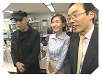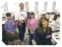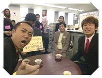 そんなわけで、初収録の日を迎えたのですが、なんと収録場所はテレ朝オフィス。デスクがずらりと並ぶなか、ふと目線を下にやると、何故だか2畳のタタミと、その上には懐かしき「サザエさん」的ちゃぶ台が…。更に、世の中の殿方たちにはたまらないセクシーギャルが3名。その名も「通勤仮面ギャルズ」??(←いつもお茶を出してくれます)なんとも不思議な撮影風景であります。でも工場じゃなくてよかった!