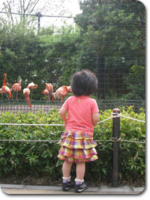 ふ、フラミンゴです!! おやおや、うちの子ったら、 はからずも、フラミンゴのような色のTシャツを着用しています!! 同じ色の衣服をまとった次女は、じっと目の前のフラミンゴを観察し続けていました。