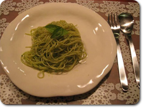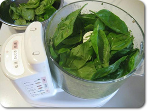 バジルの葉を摘んで、(大きなボウルに山盛り一杯くらい)洗い、 松の実とニンニク、パルメザンチーズ、オリーブオイル適量と一緒に、 フードプロセッサーにかけたら・・・