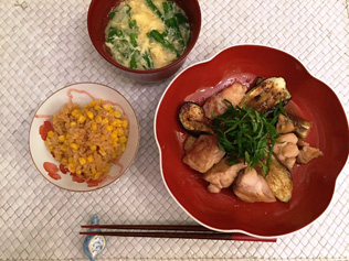 ニラと玉子の味噌汁&とうもろこしごはん&なすと鶏肉の生姜風味和え