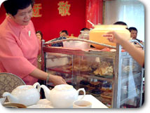 飲茶は種類ごとにワゴンで店内を回っているので実際に目で見て選ぶ事ができ、注文すると机の上の伝票に値段ごとにハンコを押してくれるのです。