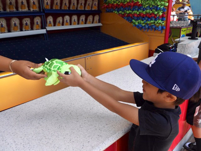 と手を引いて一周見てまわっても、彼は同じ的当てゲームを選びました。