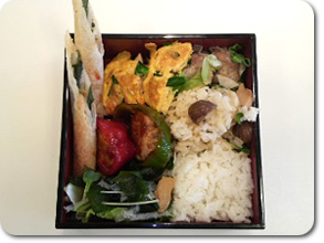 中身はにら玉、春巻き、ピーマンの肉詰め、