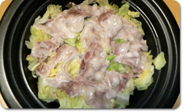 一番多く作っているのが、簡単キャベツと豚肉の蒸し料理。 材料はもやし、キャベツ、そして豚肉のみ。 敷く順番は、下からもやし、キャベツ、そして豚肉です。 水も何も入れずに、中火にかけて約10分。 蓋を開けてみて、豚肉にしっかり火が通っていたら完成です。