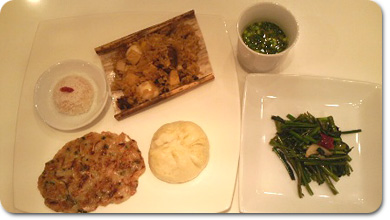 メニューは、大根餅、中華まん、ちまき、ホタテの中華風スープ、青菜の炒め物、そしてカスタードまん。
