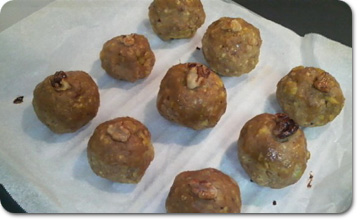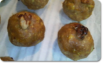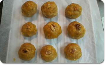 丸めたスイートポテトには、残しておいた大き目の胡桃の破片を上に乗せ、卵黄を塗るとさらに美味しく焼きあがりますよ。 |