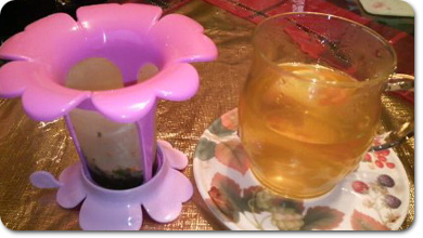 かわいい茶漉しつきなので、茶葉から煮出せ、好きな濃さのお茶が一人前から作れます。 今飲んでいるのはアップル・ベリー緑茶。