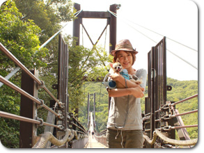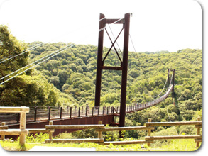 小川を横目に山道を登り、 森の中を抜けていくと、 目の前には長〜い吊り橋が! 280メートルもあるんだとか。 こんなスポットが近くにあるなんて知らなかった。