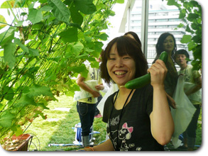 (ちい散歩スタッフも♪きゅうりを持つのは永久保さん、ゴーヤを持つのは鈴木さんです。)
