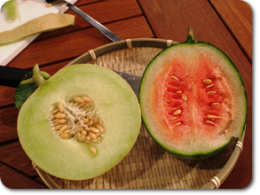 収穫して持っていったスイカとメロンは早すぎて、