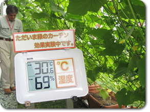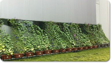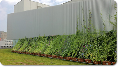 ガラス張りの長い壁を、緑のカーテンで覆うことで温度を下げて、