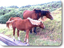 多くの与那国馬が車道の側を歩き、草を食み、ゆったり平和に暮らしていました。時には車道を塞いで休んでいることも…。