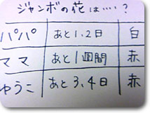 『パパの勝ち。ジャンボの花が咲いた。色は白くて気品がある』