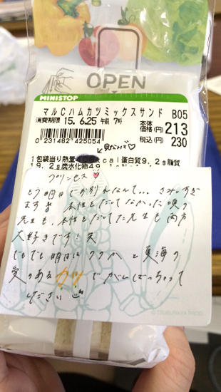 研究授業という教員免許を取るための授業をやるのですが、そのときに研究授業に勝つ!ということで、カツサンドを生徒がくれました。